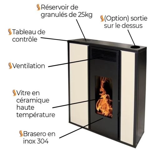 Adapté pour gagner un maximum de place, le poêle à granulés Tessa d’Interstoves est un modèle couloir extra-plat. Il est également possible de faire sortir les fumées par le dessus afin d’installer le poêle au plus proche du mur et de gagner encore plus d’espace habitable. Elle est dotée d’un système de coupure automatique en cas d’ouverture de la porte vitrée et d’une sonde de protection anti-feu avec fusible de coupure en cas de surchauffe. En plus, elle peut être installé dans toutes les configurations : sortie façade, sortie toiture ou au-dessus du faîtage.