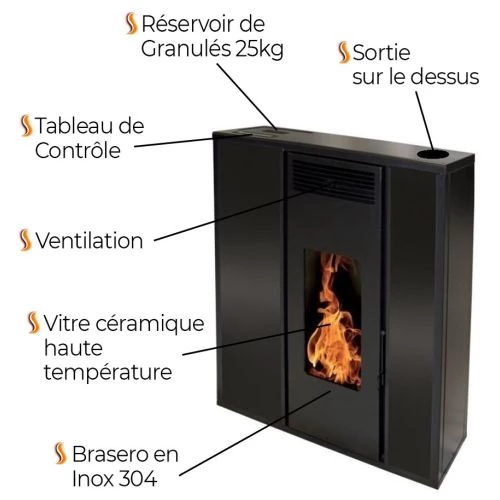 Adapté pour gagner un maximum de place, le poêle à granulés Tessa d’Interstoves est un modèle couloir extra-plat. Il est également possible de faire sortir les fumées par le dessus afin d’installer le poêle au plus proche du mur et de gagner encore plus d’espace habitable. Elle est dotée d’un système de coupure automatique en cas d’ouverture de la porte vitrée et d’une sonde de protection anti-feu avec fusible de coupure en cas de surchauffe. En plus, elle peut être installé dans toutes les configurations : sortie façade, sortie toiture ou au-dessus du faîtage.
