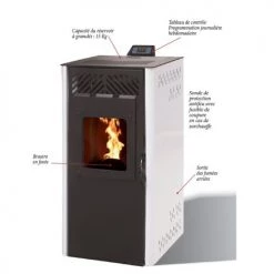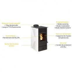 - Consommation de granulés (à puissance nominale) : 2,1 kg/h