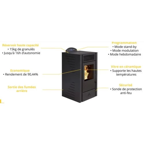 - Consommation de granulés à puissance réduite : 0,94 kg/h